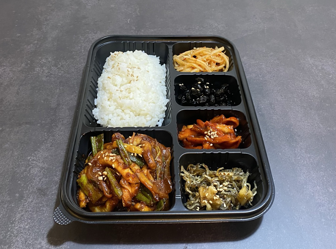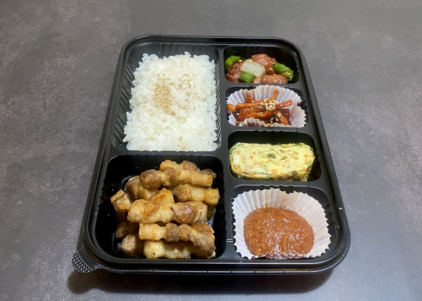 원하는 반찬을 마음대로 선택할 수 있는 나만의 수제 도시락!! 제육 수제 도시락 제육+반찬4개(선택)+밥 - 7,500원 새우튀김/계란말이/콘샐러드/두부조림/메추리알/땅콩조림/무말랭이무침/멸치볶음(견과류)/매콤멸치볶음/오징어젓갈/낙지젓갈/무생채/진미고추장조림/도라지무침/마늘쫑무침/검은콩자반/김치/소세지볶음 오징어볶음 수제 도시락 오징어볶음+반찬4개(선택)+밥 - 7,500원 새우튀김/계란말이/콘샐러드/두부조림/메추리알/땅콩조림/무말랭이무침/멸치볶음(견과류)/매콤멸치볶음/오징어젓갈/낙지젓갈/무생채/진미고추장조림/도라지무침/마늘쫑무침/검은콩자반/김치/소세지볶음 돼지불백 수제 도시락 돼지불백+반찬4개(선택)+밥 - 7,500원 새우튀김/계란말이/콘샐러드/두부조림/메추리알/땅콩조림/무말랭이무침/멸치볶음(견과류)/매콤멸치볶음/오징어젓갈/낙지젓갈/무생채/진미고추장조림/도라지무침/마늘쫑무침/검은콩자반/김치/소세지볶음 삼겹살 수제 도시락 삼겹살+쌈장+반찬3개(선택)+밥 - 7,500원 새우튀김/계란말이/쌈무/콘샐러드/두부조림/메추리알/땅콩조림/무말랭이무침/멸치볶음(견과류)/매콤멸치볶음/오징어젓갈/낙지젓갈/무생채/진미고추장조림/도라지무침/마늘쫑무침/검은콩자반/김치/소세지볶음 소불고기 수제 도시락 소불고기+반찬4개(선택)+밥 - 7,500원 새우튀김/계란말이/콘샐러드/두부조림/메추리알/땅콩조림/무말랭이무침/멸치볶음(견과류)/매콤멸치볶음/오징어젓갈/낙지젓갈/무생채/진미고추장조림/도라지무침/마늘쫑무침/검은콩자반/김치/소세지볶음 메뉴 듀록삼겹살(300g)+쌈장 10,000원 제육볶음 8,000원 오징어볶음 8,000원 돼지불백 8,000원 소불고기 8,000원 사이드/음료 새우튀김(6마리) 4,000원 콘샐러드 4,000원 공기밥 1,000원 코카콜라(355ml) 1,500원 사이다(355ml) 1,500원 운영시간 평일(오전 10:00~오후 8:30) 토요일(오전 10:00~오후 8:00) 일요일(휴무)